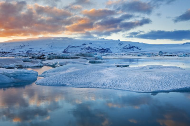 glacier de Solheimajökull niché entre montagnes et son bassin d’eaux opaques.